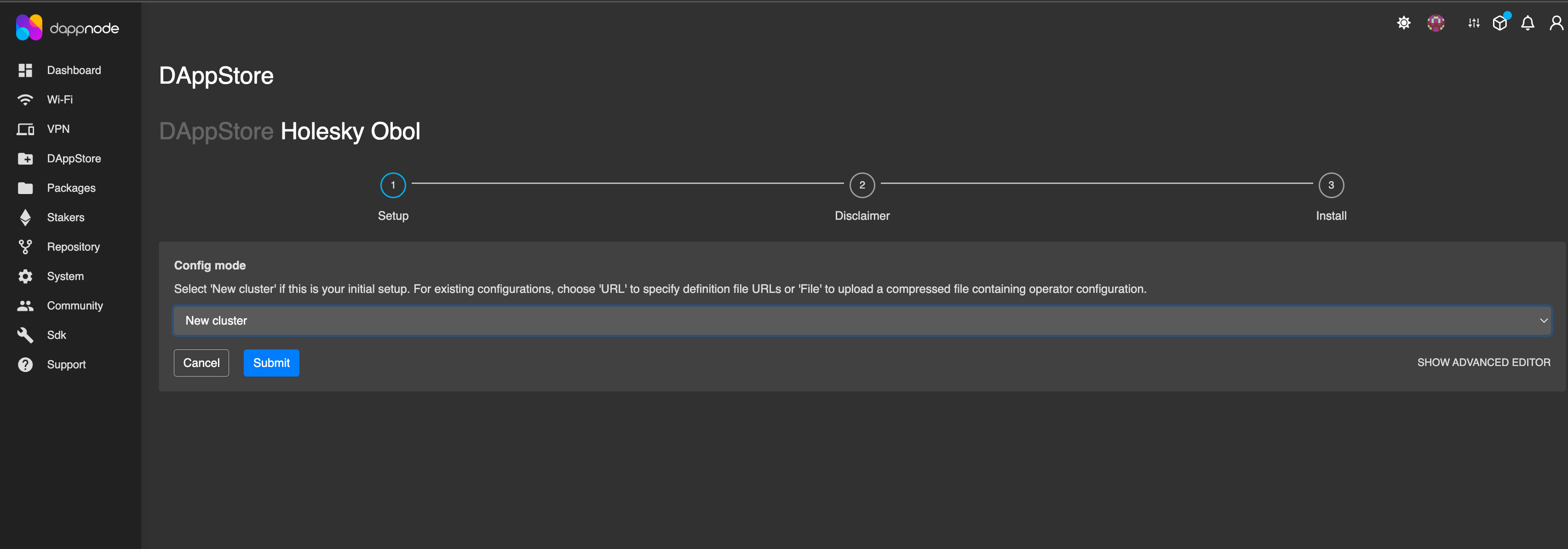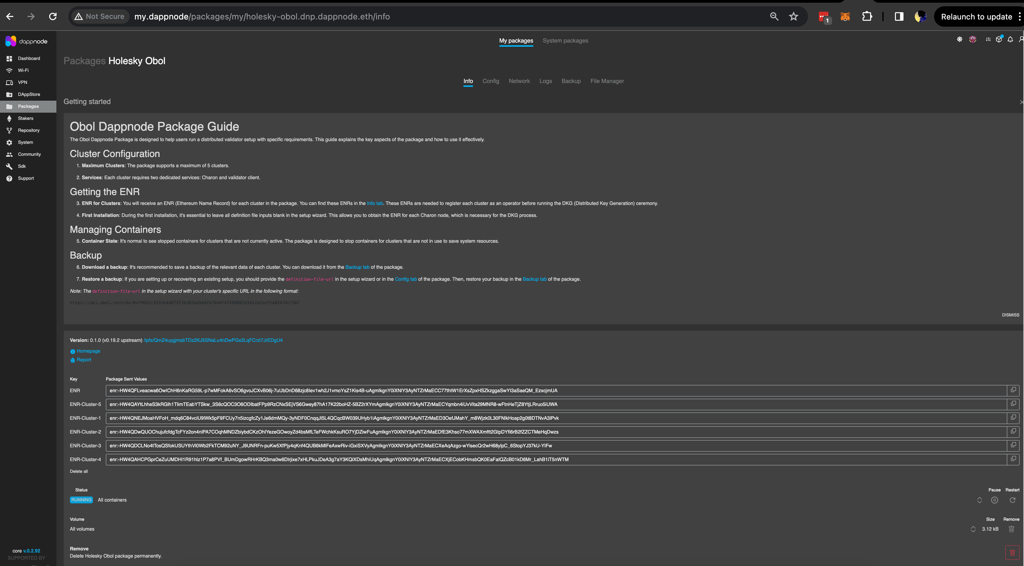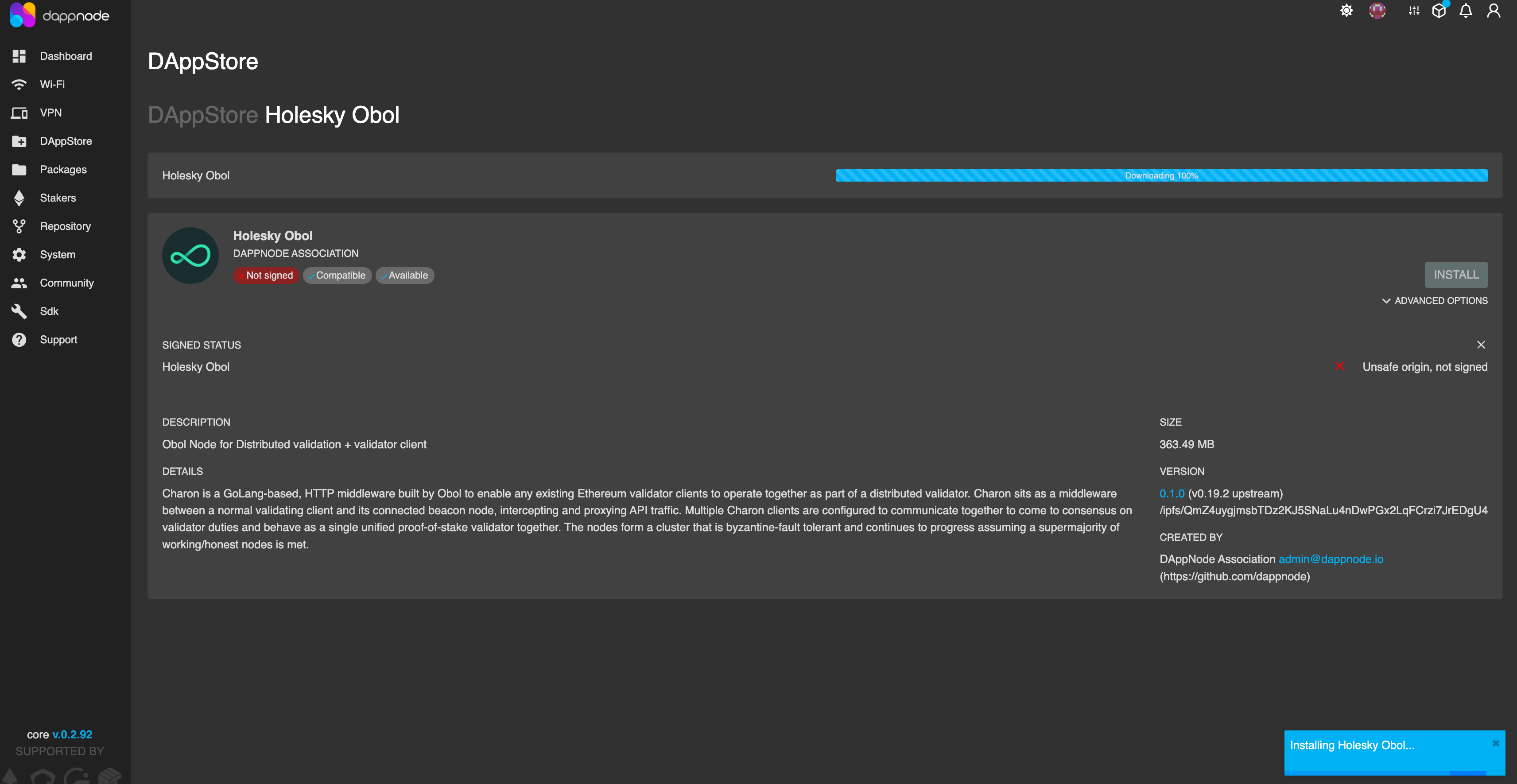 With a fully synced Ethereum node now running on the DappNode, the below steps will walk through installing the Obol package via an IPFS hash and preparing for a Distributed Key Generation ceremony. Future versions of this guide will download the package from the official DappNode DappStore once a stable 1.0 release is made.