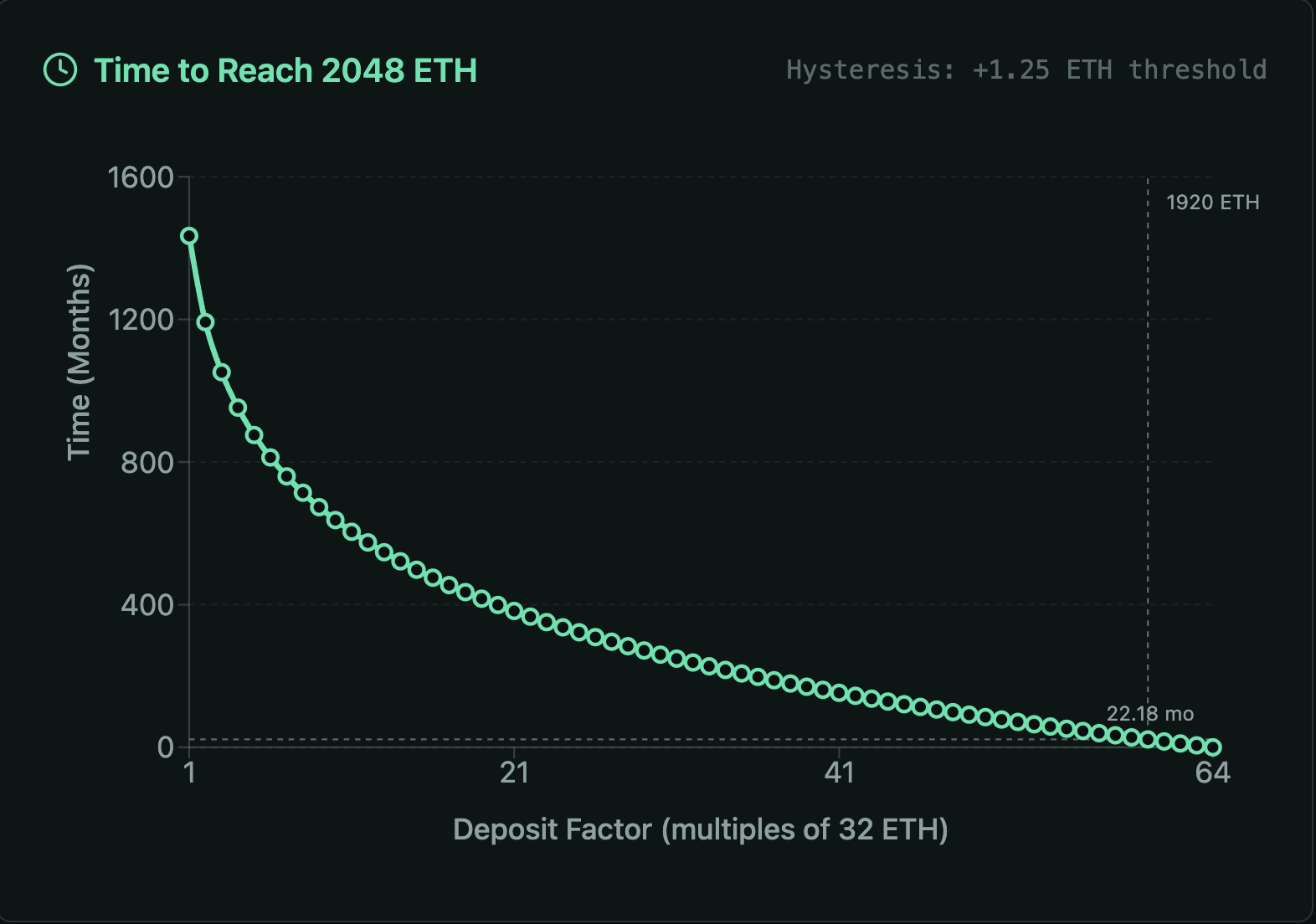 To maximize compounding efficiency, avoid depositing the full 2048 ETH cap immediately. Leaving \~128 ETH of "headroom" allows your validators to compound rewards autonomously for approximately 2 years (at 3% APR) before hitting the 2048 ETH effective balance cap.